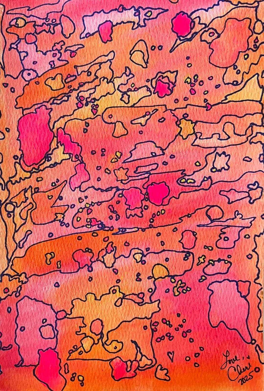 Another exercise in reverse painting. The shapes create themselves as I go. I feel like there's a story in it. I'm not yet sure what the story is, but I like the blushing colors, and the way the little dots travel around in it. There's so much movement. It's like so many things that feel nebulous until we work to understand them. Like self love. Love yourself. Love others. Make art.
