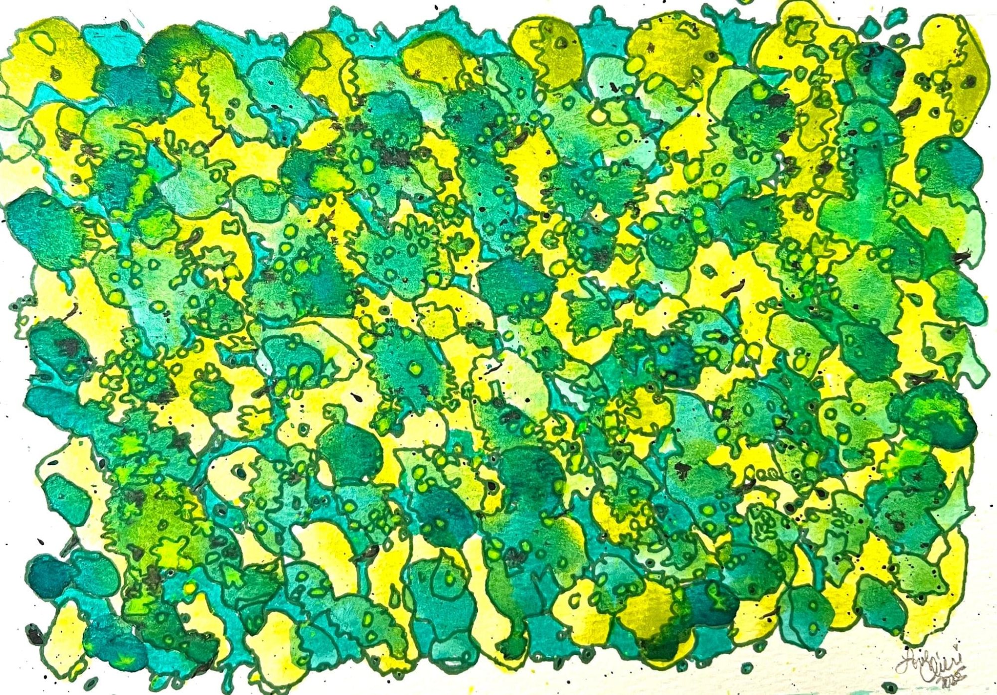 Green, with green and more green. Some splattering of black. More light than darkness. That's a good place to focus! Love yourself. Love others. Make art.